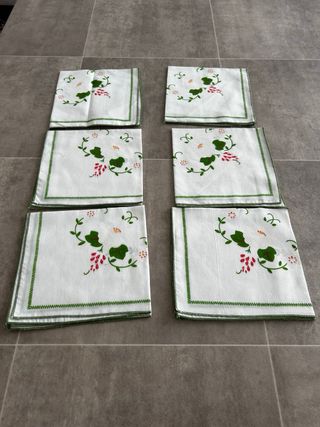 Set di sei tovaglioli in cotone con ricamo floreale. - Motivo floreale con foglie verdi e bacche rosse. - Bordo rifinito con cucitura verde.