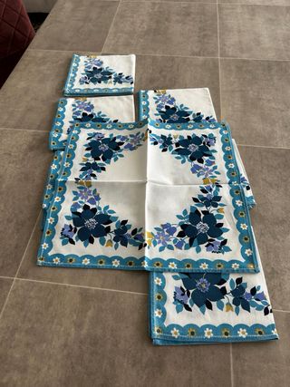 Set di otto tovaglioli in cotone con un bellissimo motivo floreale. - Design con fiori blu e dettagli colorati. - Bordo decorativo con motivo a onda.