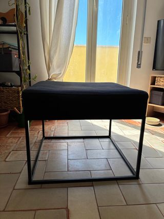 Pouf elegante con finitura morbida e base metallica lucida. Rivestimento in velluto. Base con finitura dorata.