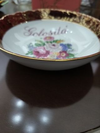 Elegante porta dolci con decorazioni floreali. - Bordo decorato in oro. - Scritta Golosita sul fondo.