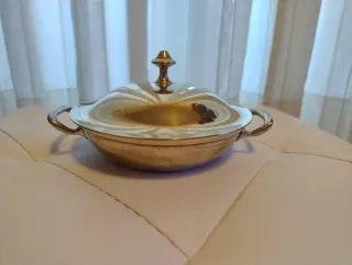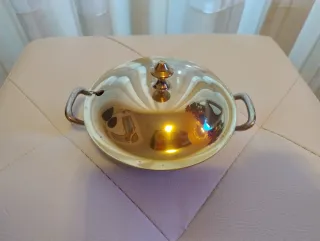 Elegante formaggiera o zuccheriera in silver plated, colore tendente all'oro. Design classico con manici. In ottime condizioni!