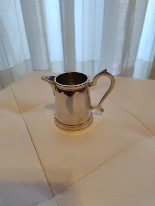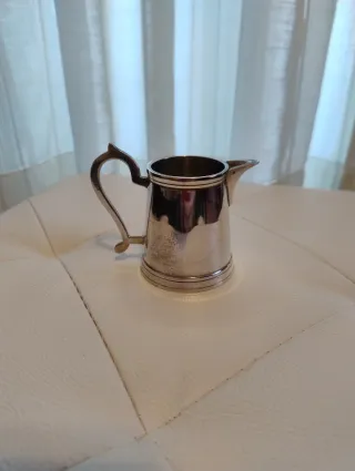 Piccola brocca in metallo per latte/crema/acqua placcato argento, design elegante con manico curvo a forma di cuore. Bordi rifiniti con sottili linee decorative. Con alcuni segni del tempo ma comunque in buonissime condizioni!