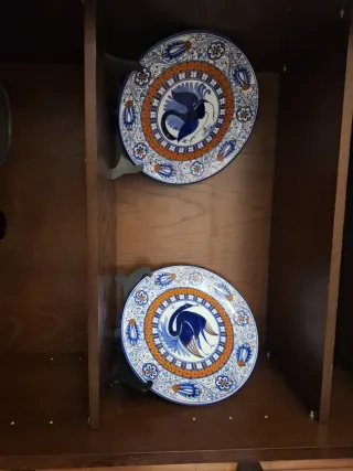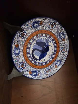 Set di due vassoi decorativi in ceramica, perfetti per aggiungere un tocco di colore alla tua casa. - Design con uccelli blu e motivi floreali. - Bordi arancioni e dettagli blu. - Realizzati in ceramica di alta qualità.