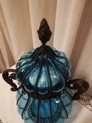 Elegante vaso in vetro soffiato ondulato blu, racchiuso in una robusta gabbia in metallo con manici decorativi e un coperchio con pomello. Bellissimo, antico, vintage! Vetro in ottime condizioni e il metallo presenta una leggera patina dovuta al tempo!