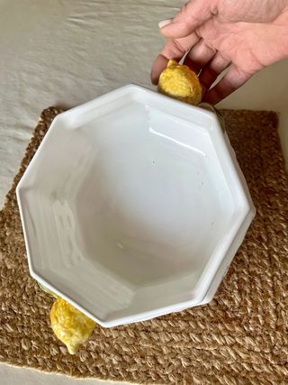 Elegante ciotola vintage anni 80 È in ceramica decorata con dettagli di limoni. Forma ottagonale . La base presenta un motivo che ricorda un cesto intrecciato. Larghezza ( senza manici ) cm 20 . Altezza 10 cm . - Design a forma di cesto. - Manici a forma di limone.