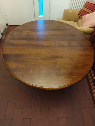 Elegante tavolo rotondo con base centrale realizzato in noce massello in ottime condizioni del diametro di 120 cm, altezza da terra 80 cm. Il tavolo e' dotato di due prolunghe a corredo utili per apliare la lunghezza.