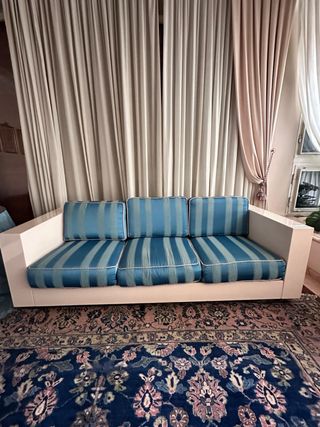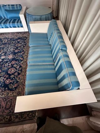 Vendo coppia di iconici divani 3 posti Saratoga originali degli anni '60/'70. Design Lella e Massimo Vignelli per Poltronova . Acquistati da Poltronova negli anni 60/70. Pezzi di design che aggiungono un tocco vintage a qualsiasi ambiente. Il rivestimento in pelle é stato tolto negli anni 90 e sostituito con quello che vedete in foto . Condizioni ottime . Ritiro a Prato . No perdigempo. - Struttura in legno. - Rivestimento in tessuto. - Sedute e cuscini a righe blu e azzurre.