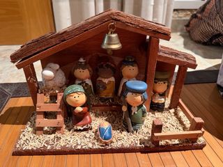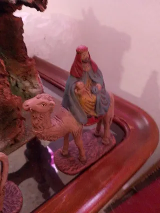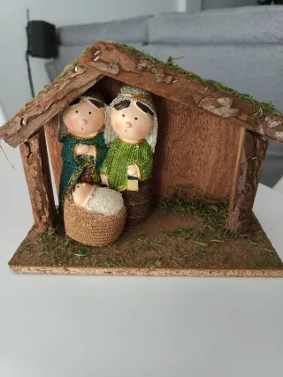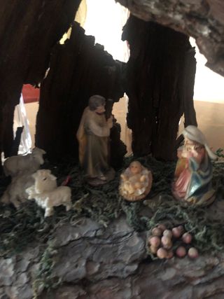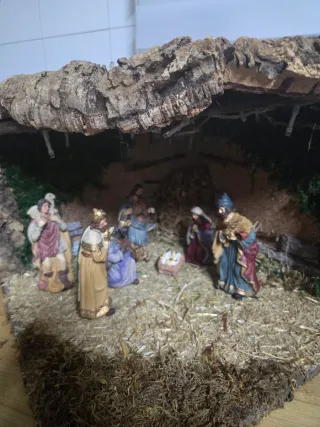 Set di presepe natalizio con vari elementi decorativi e figure. Include un CD di canti natalizi. Elementi in sughero, plastica e legno. In regalo un Gesù Bambino in arte moderna di Olot da restaurare. Portale del presepe realizzato in un cocco con possibilità di illuminazione, guarda tutte le foto.