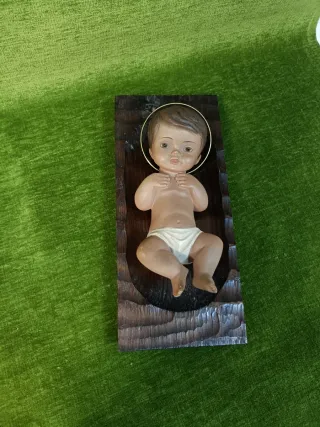 Figura del Bambino Gesù in un presepe intagliato. Dettagli dipinti a mano. Aureola dorata. Base in legno scuro.