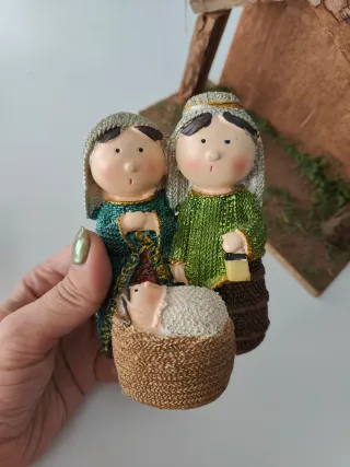 Presepe artigianale, ideale per decorare la tua casa a Natale. Include figure di San Giuseppe, la Vergine Maria e il Bambino Gesù. Cesta intrecciata per il bambino. Dettagli di bastone e tuniche. Base nera per il supporto. Vestiti in tessuto.