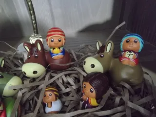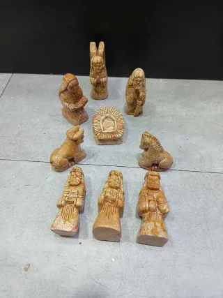 Set di figure per presepe, realizzate in argilla o ceramica con un finitura rustica. Figure in stile tradizionale, tonalità terrose e dettagli in rilievo. Ideale per creare il tuo presepe.