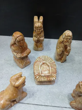 Set di figure per un presepe. Include varie figure di persone e animali. Fabbricate in pietra.