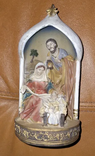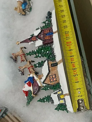 Vendo presepe popolare artigianale di dimensioni pari a 28 × 23 cm, ideale per piccoli spazi. Completo di statuine Landi Moranduzzo di altezza 10 cm. L'illuminazione del presepe è garantita attraverso 2 batterie tipo stilo in comodo contenitore con interruttore, quindi non necessita di collegamento alla rete elettrica. Data la fragilità dell'articolo preferisco scambio a mano.