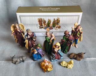 Set di figure per un presepe natalizio, presentato nella sua scatola originale. Include figure di personaggi e animali. La scatola permette un ordinato stoccaggio.