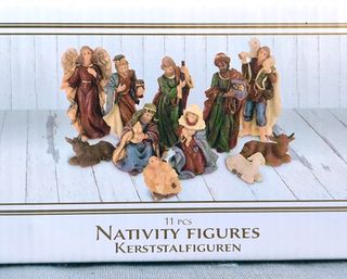 Set completo e realistico di 11 figure natalizie per formare un presepe. Include le figure di Gesù Bambino, Maria, Giuseppe, un pastore, un angelo, i 3 Re Magi, un asino, un bue e una pecora. Ogni figura è in resina e include molti dettagli realistici. Altezza delle figure: 9,5 cm. Materiale: resina. NUOVO