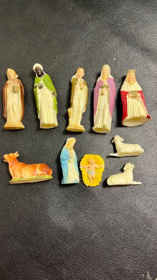 Set di figure per presepe in plastica. Include figure di personaggi e animali. Colori beige e viola.