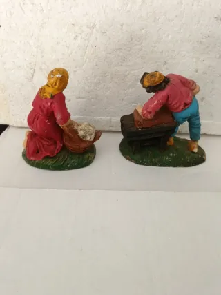 Due figure di pastori per presepe realizzate in cartapesta. Rappresentano due scene di vita quotidiana. - Figura di donna che lava i panni in una cesta. - Figura di uomo che lavora su un banco da falegname.