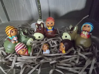 Set di figure e portale per il presepe natalizio. Include figure di bue, mulo, bambino, Giuseppe, Maria, 3 Re Magi, pastore. Portale del presepe, mandria di fattoria e altra decorazione rotabile (vedi foto). Elementi decorativi aggiuntivi, carta per creare la base, muschio, contenitori per neve, pietre naturali. Crea un presepe spettacolare.