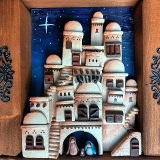 Delizioso quadretto raffigurante un presepe stile arabo, con dettagli curati, interamente realizzato a mano.