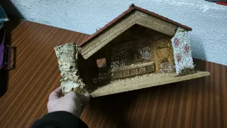 Presepe grande, ideale per la tua decorazione natalizia. Costruito con materiali naturali come sughero e legno. Struttura della casa con tetto in sughero, colonne e dettagli in corteccia d'albero, base in legno. Una finestra è leggermente staccata dal tetto, ma può essere incollata, quindi è perfetta, da qui il prezzo.