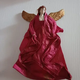 Figura decorativa di angelo, ideale per il tuo presepe. Corpo in porcellana, ali dorate, vestito di carta rosso. Gancio per appenderlo se lo si desidera.