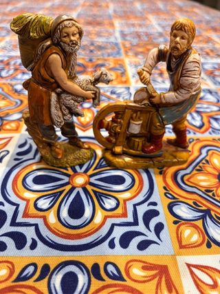 Set di personaggi per presepe, realizzati con cura. - Figura di un uomo con agnello. - Figura di un uomo al lavoro con macchinario. - Dettagli colorati e finiture accurate.