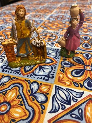 Set di personaggi per presepe. - Figura con cesto di pane. - Figura con brocca d'acqua. - Base decorata con mattoni e vegetazione.