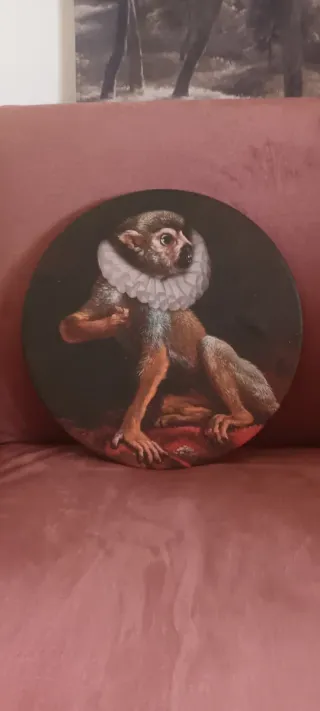 Dipinto circolare raffigurante una scimmia con un collare decorativo. L'opera presenta dettagli curati e colori vivaci. - Forma rotonda con struttura in metallo e gancio integrato per appenderlo. Rappresenta una porzione di un dipinto ad olio classico con due scimmie e due uccelli. Quest'opera è ispirata al dipinto originale intitolato "De Menagerie" (Lo zoo) dell'artista olandese del XVII secolo Melchior de Hondecoeter. Comprato su westwing. Misure 38 cm do circonferenza
