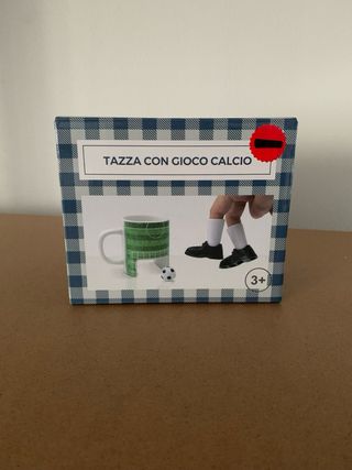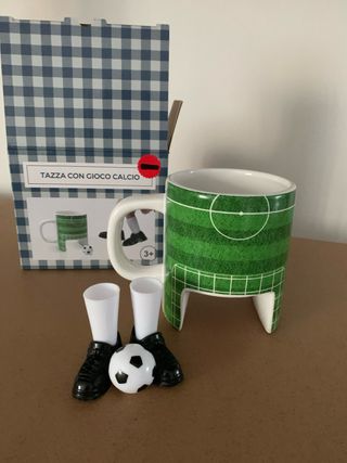 Simpatica tazza a tema calcistico, perfetta per gli appassionati. - Design a campo da calcio. - Include accessori a tema. - interattivo. tazza con porta e due gambe da mettere alle dita per calciare la palla e fare goal