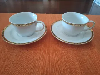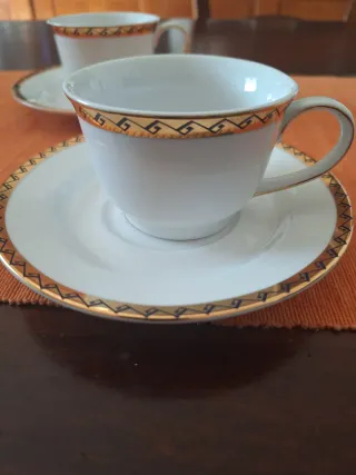 Eleganti tazze da cioccolata Caffarel, perfette per gustare la tua bevanda preferita. - Decorazione con bordo dorato e motivo geometrico. - Set di due tazze con piattini.
