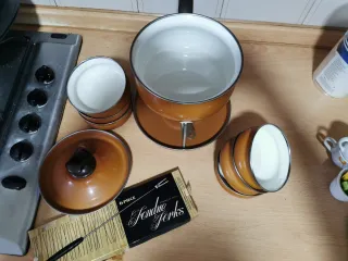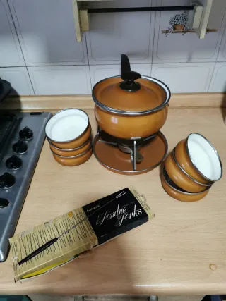 Set per fonduta composto da pentolino, bruciatore e ciotoline. - Pentolino in metallo con finitura esterna marrone e interna bianca. - Supporto per bruciatore in metallo. - Sei ciotoline impilabili con finitura esterna marrone e interna bianca. - Coperchio con manico in plastica.
