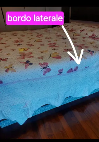 Raffinato copriletto trapuntato primaverile con volant a pois laterali. Allegro motivo di farfalle che sembrano dipinte. Aggiunge un tocco di colore e allegria alla camera da letto. Ai piedi del letto è stato cucito artigianalmente un bordo scozzese per aumentare la superficie da ricalzare al materasso. - Motivo a farfalle in varie tonalità. - Tessuto trapuntato per un comfort extra. - Finitura con bordo a contrasto. il mio letto misura misura 180 x 200 effetto bordo laterale coprente come da foto.