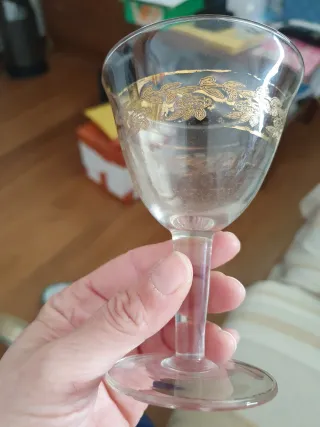 3 bicchieri calice con decorazioni dorate. - Design vintage. - Finitura trasparente con dettagli oro.