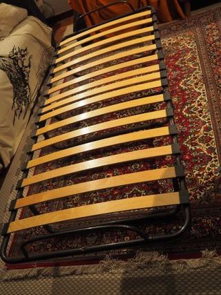 Base letto singola con doghe in legno, facile da riporre grazie al suo design pieghevole. dotata di ruotine perfettamente funzionanti, usata pochissimo - Struttura portante in metallo. - Doghe in legno.