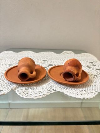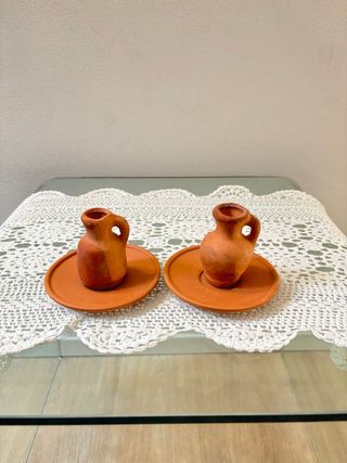 - Set composto da due mini anfore, realizzate in terracotta grezza, complete dei piattini coordinati. - 100% Terracotta. - Ottime condizioni vintage, come visibile in foto. Non presentano sbeccature. - Misure: Vaso Rotondo Altezza: 7cm / Base: 3,5cm / Larghezza: 7cm / Bocca Vaso: 3cm. Vaso Squadrato Altezza: 7 cm / Base: 3,5 / Larghezza: 4,5cm / Bocca Vaso: 2cm. • spedizione rapida e imballaggio super accurato.
