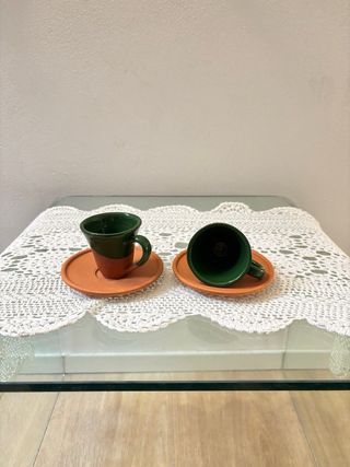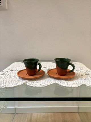 Set da caffè stile artigianale, tazzina e piattino coordinato. • Terracotta. • Parte superiore smaltata in verde scuro lucido. • Misure: Base: 2,5 cm/ Altezza: 6 cm/ Apertura superiore: 5,5 cm | Piatto: 11 x 11 cm Spedizione rapida e imballaggio super accurato.