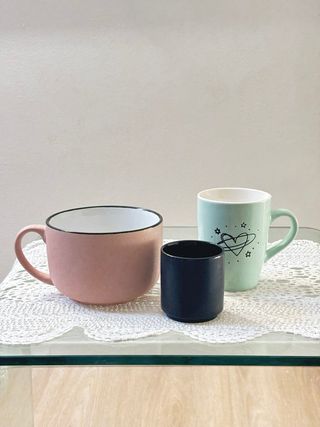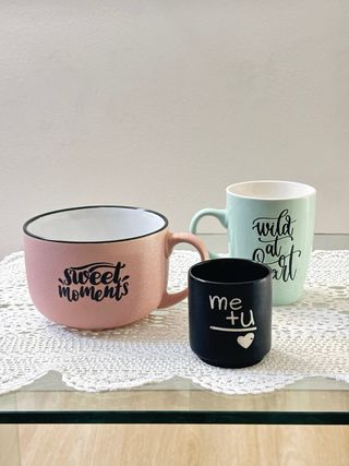 Set di tre tazze in ceramica, ognuna con un design e una dimensione unica. Perfette per ogni occasione. - Tazza grande color rosa con scritta sweet moments. - Tazza media color menta con scritta wild at heart. - Tazzina piccola nera con scritta me + u e un cuore. Spedizione rapida e imballaggio super accurato