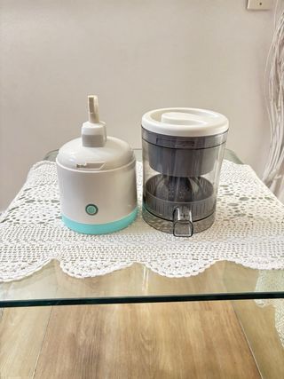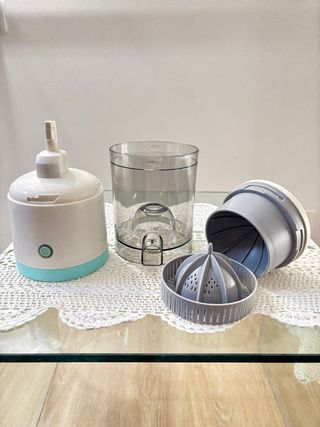 Spremi agrumi composto da diversi pezzi. - Base bianca e azzurra con pulsante. - Bicchiere trasparente graduato. - Accessorio spremiagrumi grigio. Spedizione rapida e imballaggio super accurato.