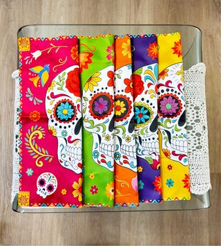 Set di sei tovagliette da tavola con un vivace design a teschio messicano. - Fantasia colorata con teschi e fiori. - Bordo decorato con pizzo. - Ideali per aggiungere un tocco unico alla tua tavola. - Tovaglia dello stesso set. Misure: 2,30x2,10cm