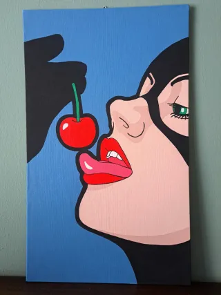 Quadro dipinto a mano, raffigurante Catwoman con ciliegia. Dipinto a mano acrilico su tela cartonata, colori brillanti. Ottimo stato. Dimensioni 30x50 cm spessore 3 mm. - Soggetto: Catwoman - Tecnica: Pittura a mano - Sfondo: Blu - Dettagli: Ciliegia rossa