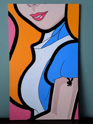 Quadro dipinto a mano in stile pop art ispirata ad Alice nel Paese delle Meraviglie con tatoo playboy. Colori brillanti. Nuovo. Dimensioni 30x50 cm spessore 3mm. - Design vivace e colorato. - Raffigurazione stilizzata del personaggio. - Ideale per aggiungere un tocco artistico all'ambiente.