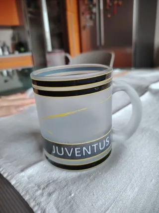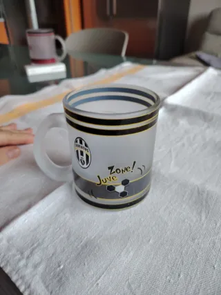 Bicchiere con logo e scritte a tema calcistico. - Design con strisce nere, bianche e blu. - Grafica Juve Zone! e pallone da calcio. - Manico in vetro satinato.