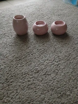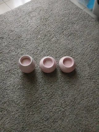 Set di tre graziosi portacandele. - Realizzati in ceramica. - Colore rosa tenue.