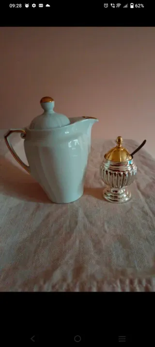 Elegante set composto da lattiera e zuccheriera. - Lattiera in porcellana bianca con dettagli dorati. - Zuccheriera in metallo argentato con coperchio dorato e cucchiaino. Nuovi