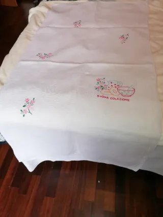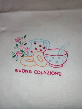 Deliziosa tovaglietta con ricami floreali e una simpatica immagine a tema colazione. Tessuto primi 900 - Ricami a mano con fiori rosa e verdi. - Scritta Buona Colazione con disegno di tazza e biscotti. - Tessuto bianco con texture a rilievo. Piccolo strappo vicino al ricamo, vedi foto