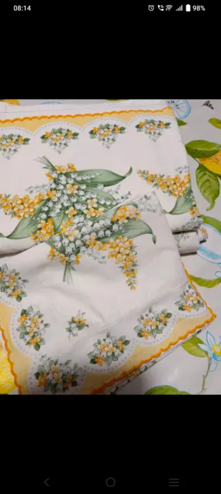 Elegante set di lenzuola per letto matrimoniale con una delicata stampa floreale. - Motivo di fiori di mughetto e altri fiori gialli. - Bordi decorati con un motivo a onde gialle e bianche. - Tessuto di alta qualità. Sopra sotto e due federe