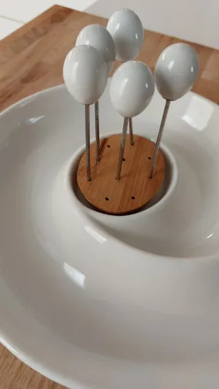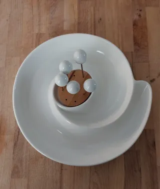 Elegante vassoio Brandani con un design a spirale unico. Perfetto per servire stuzzichini o come elemento decorativo. - Base in legno con 5 spiedini con sfere bianche. - Finitura lucida.