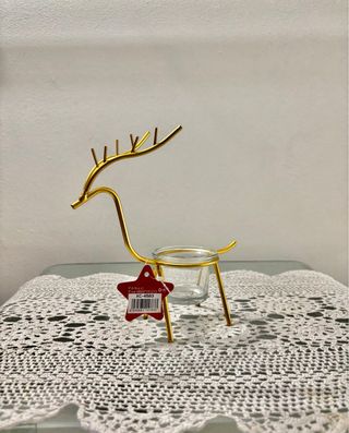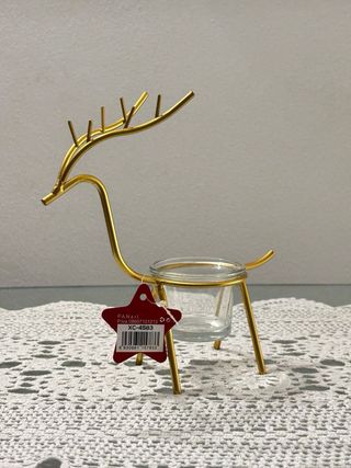 Elegante portacandele a forma di cervo, perfetto per aggiungere un tocco di stile alla tua casa. Un'idea regalo originale. - Design raffinato a forma di cervo. - Struttura in metallo dorato. - Contenitore in vetro trasparente.