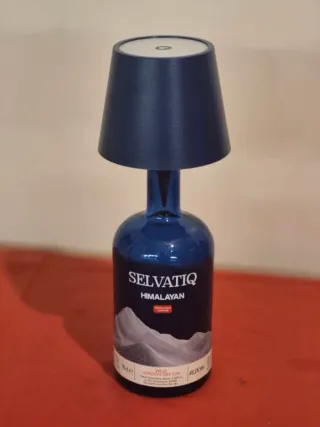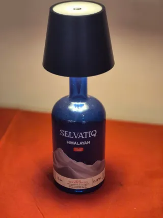 Lampada di design a forma di bottiglia di gin Selvatiq. - Base in vetro blu. - Paralume nero. - Luce LED integrata.