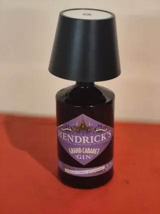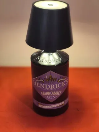 Lampada decorativa unica, creata da una bottiglia di Hendrick's Gin. - Design originale e accattivante. - Base in metallo lucido. - Paralume nero elegante.